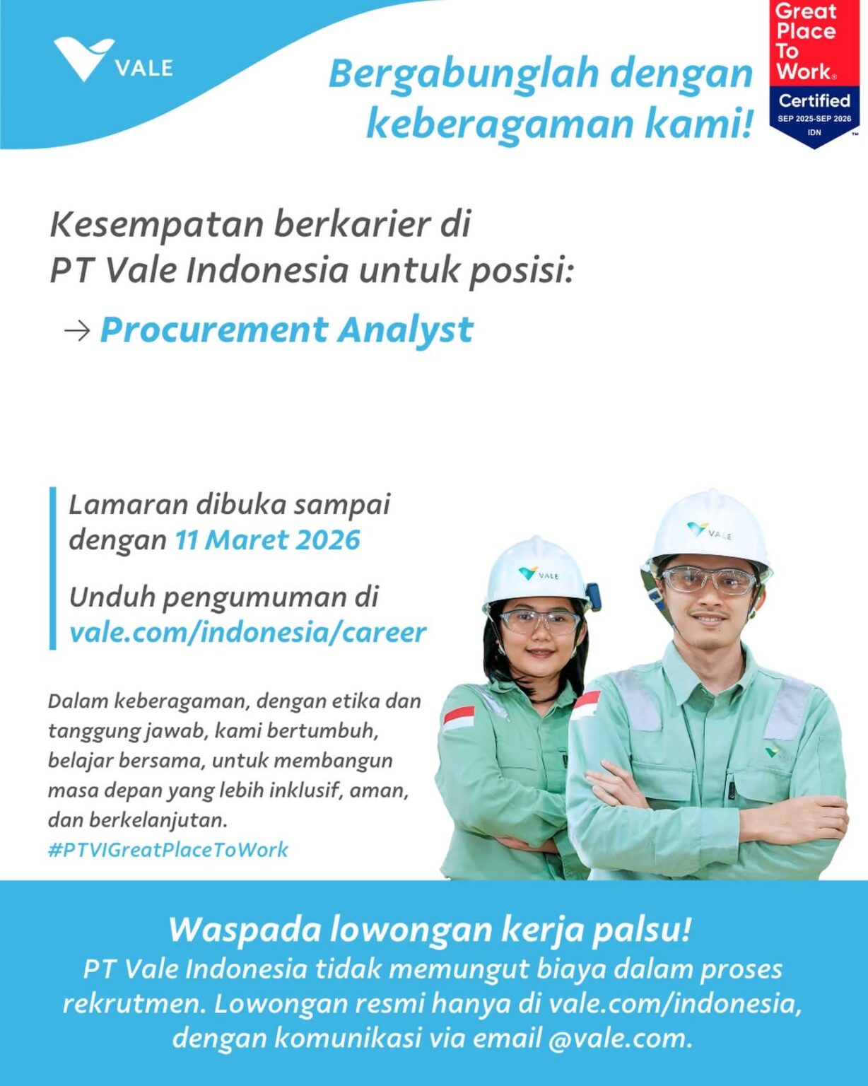 Kabar baik bagi para profesional yang ingin mengembangkan karier di industri pertambangan berkelanjutan. PT Vale Indonesia kembali membuka kesempatan berkarier untuk posisi Procurement Analyst, dengan batas akhir pengiriman lamaran pada 11 Maret 2026.